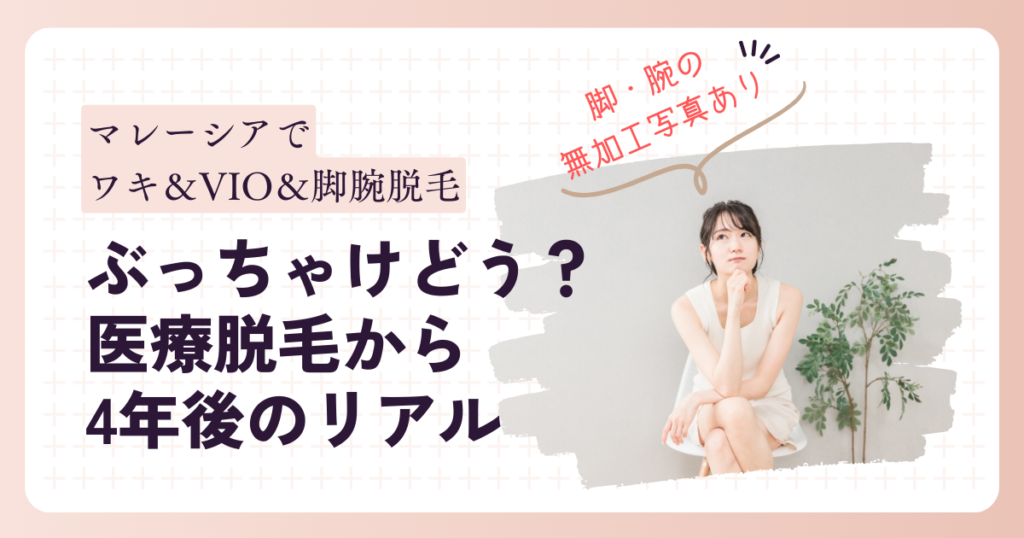 「医療脱毛って数年後にまた生えてくる?」マレーシアでの両ワキ&VIO脱毛から4年経ったリアルな効果を、腕・脚の無加工写真付きで本音レポ!気になるVIO事情や、日本の脱毛サロンとの違いまで、海外美容の実体験を徹底解説します。 -